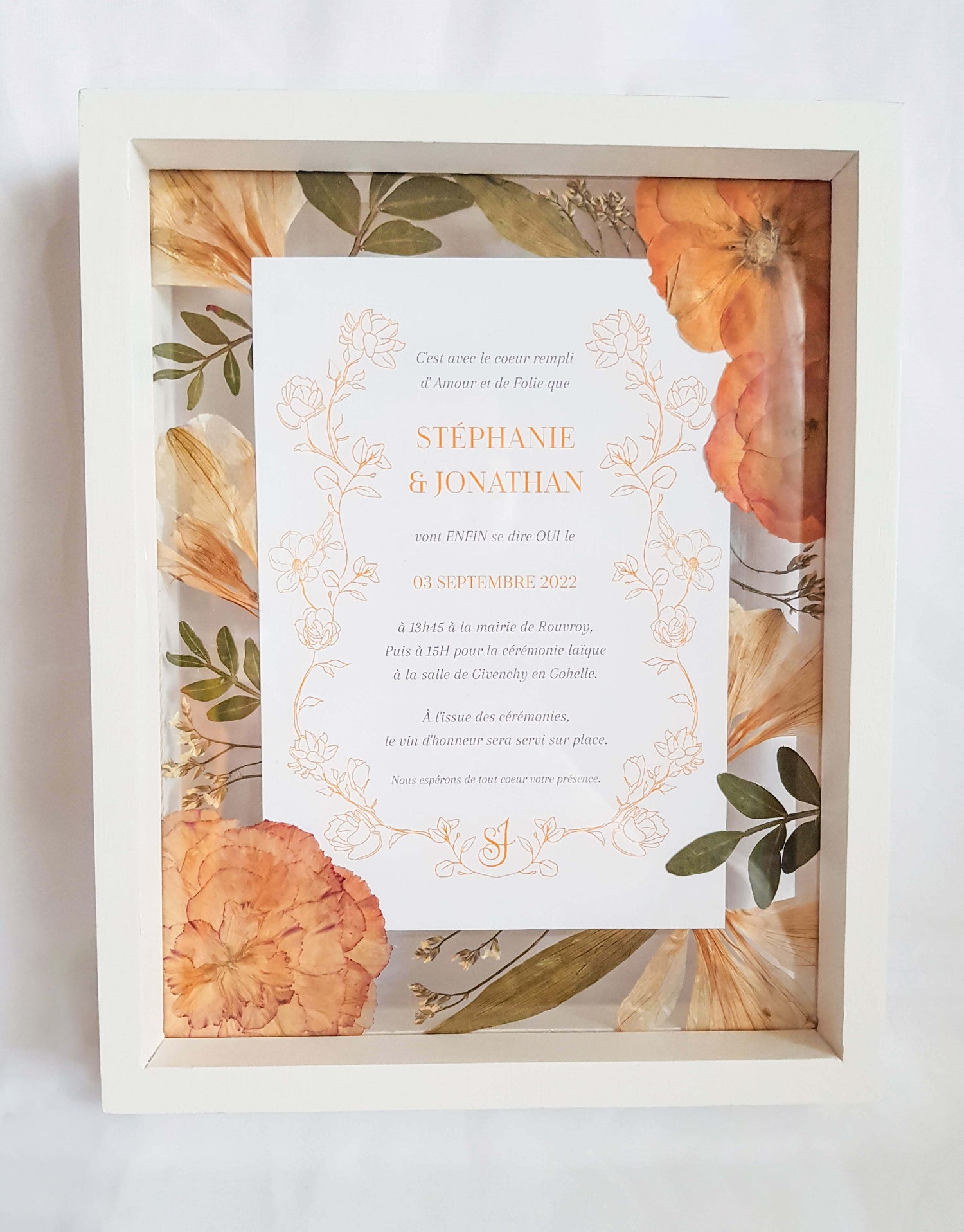 Des bouquets de mariées aux arrangements commémoratifs, je prends vos fleurs et vos faire-part, photos, invitations et je les transforme en un cadre souvenir éternel qui peut être exposé chez vous.