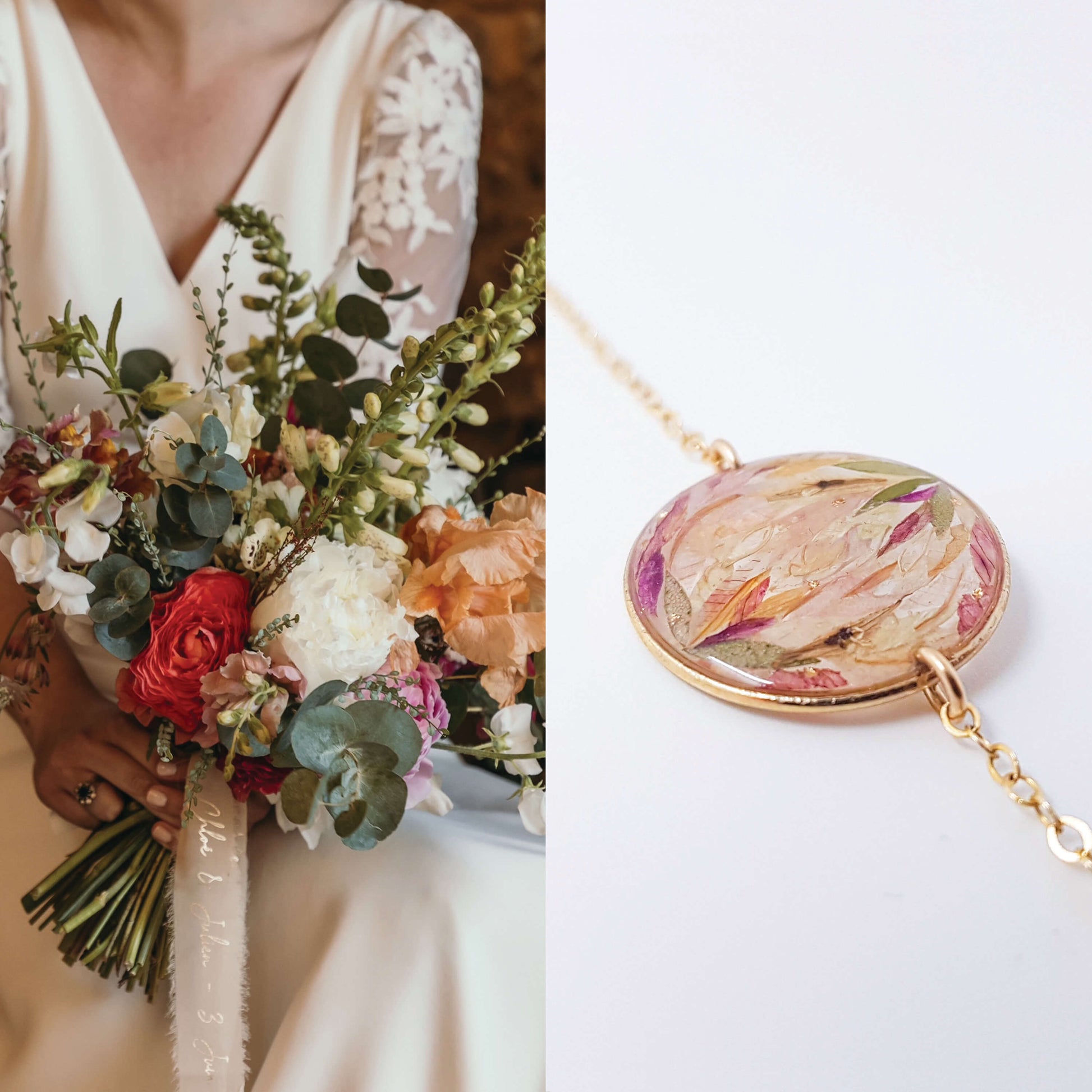 Conservez vos fleurs sous la forme d'un bijou mémoire. Le bouquet est upcyclé.